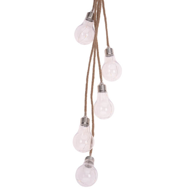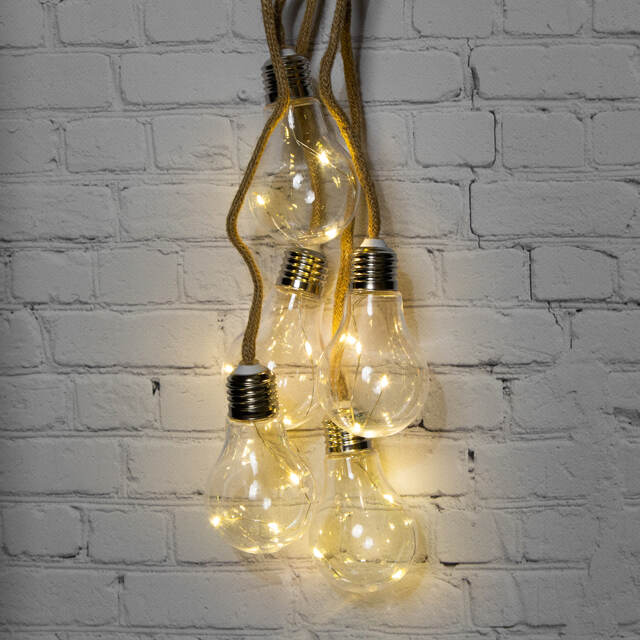 Декоративный светильник в стиле лофт обязательно понравится любителям необычного и уютного декора. Он выполнен в виде грозди из лампочек, которые очень похожи на обычные электрические, но внутри у них не нити накаливания, а тонкие спирали со светодиодами. Сочетание прозрачных ламп и натурального джутового шпагата придает образу светильника для декора настоящий ретро-шарм. В композиции с другими винтажными украшениями или минималистичными элементами декора такой аксессуар будет смотреться эффектно и гармонично.