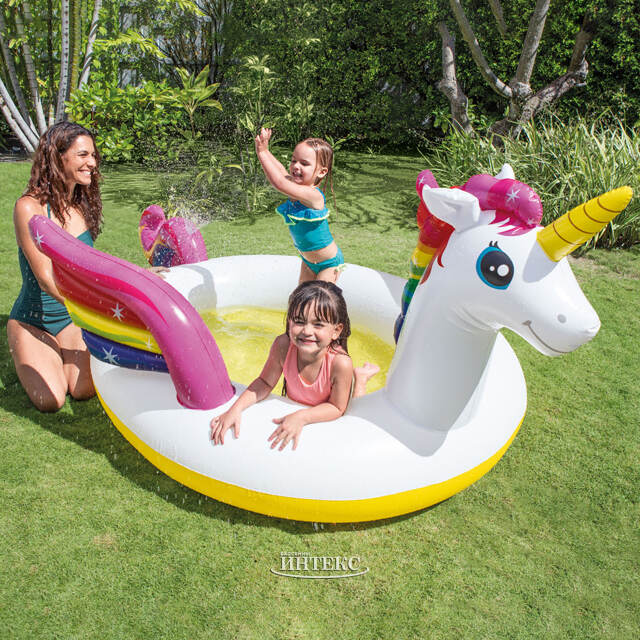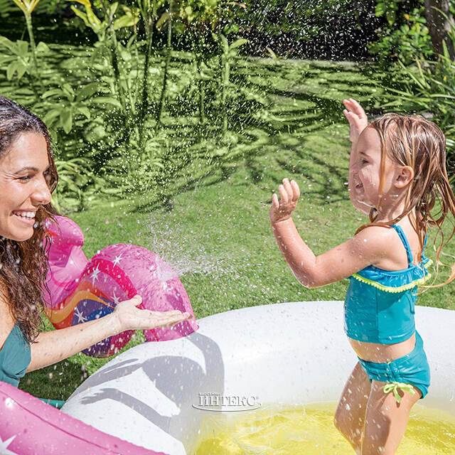 Детский надувной бассейн INTEX 57441 в виде волшебного Единорога от компании Интекс понравится каждому ребенку. Небольшой фонтанчик, бьющий из его хвоста, придает данной модели надувного бассейна дополнительное очарование. Для работы фонтанчика вам понадобится обычный садовый шланг, который нужно подключить к специальному отверстию в бассейне. Если бассейн с фонтанчиком чрезмерно наполнился, достаточно открыть клапан в нижней части бассейна, чтобы выпустить лишнюю воду.
