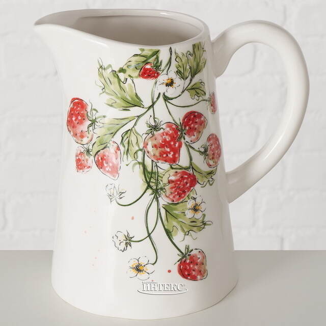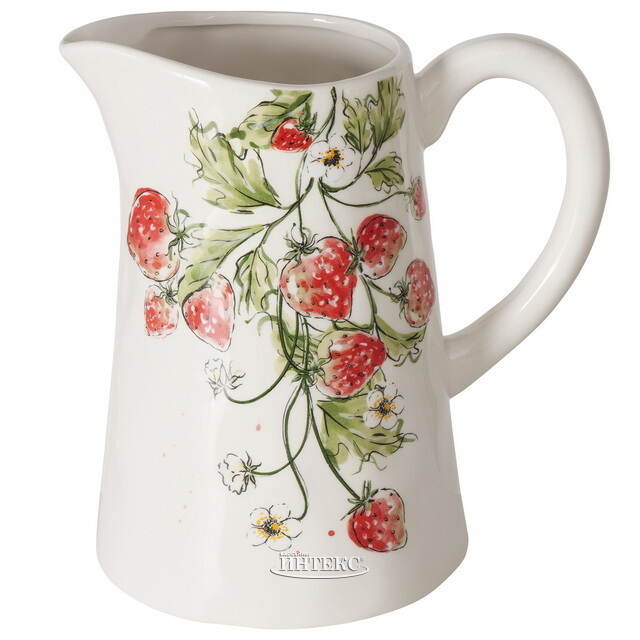 Кувшин Sweet Strawberries - керамический красавец с летним настроением, наполненным сладким ароматом ягод! Классическая форма с удобной ручкой и носиком делает его удобным для подачи на стол холодных напитков. Красочный ягодный мотив на белой поверхности задает легкое настроение и вписывается в приятную трапезу на даче, в беседке, и даже в городской квартире. Оптимальная емкость, форма и дизайн позволяют также использовать сосуд как вазу.