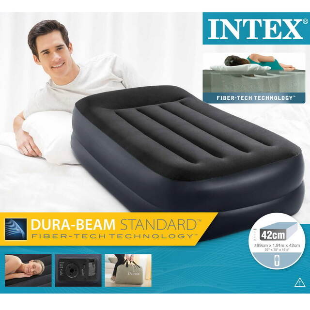 Кровать Intex выполнена с применением технологии Fiber-Tech - в качестве внутренних перекрытий используются не перегородки из ПВХ, а тысячи прочных полиэфирных волокон-нитей, соединяющих изнутри верх и основание матраса - они сохраняют общую ровную высоту кровати даже при давлении на нее с одной стороны. С применением этой технологии невозможно сильное продавливание кровати в одной части, поэтому она лучше сохраняет равновесие и правильную форму.