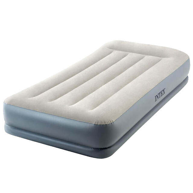 Односпальный надувной матрас со встроенным насосом Pillow Rest Mid-Rise Twin - одна из самых удобных моделей низких кроватей Intex. Домашние матрасы для сна практичны при хранении, так как занимают меньше места, но при этом сохраняют комфорт высоких кроватей. Матрас Интекс изготовлен из прочного винила. Флокированное покрытие кровати не даёт соскальзывать белью и очень легко чистится. Небольшой подголовник позволяет обойтись без отдельной подушки. Встроенный электронасос позволяет быстро надувать и сдувать кровать и дает возможность отрегулировать ее упругость. При отсутствии электричества кровать можно накачать механическим насосом. Для этого в центре клапана расположено отверстие для подключения механического насоса.