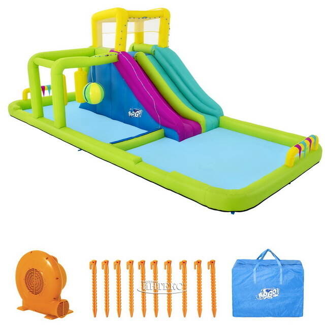 - В наборе: игровой центр, компрессор, 10 колышков, сумка для хранения, 1 шланг, набор для ремонта, 6 флажков, 1 разбрызгиватель.